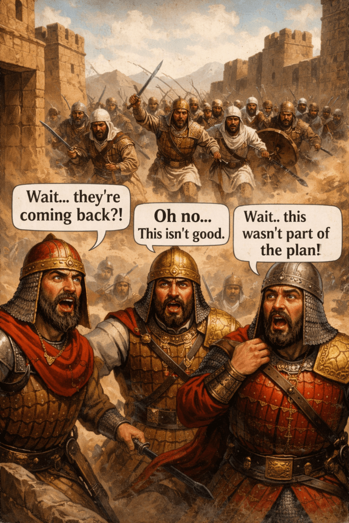 Ciidankii Beershiya waxay isku qariyeen qalcado iyo buuro, iyagoo sugayay in Muslimiintu soo weeraraan. Laakiin Nu’maan wuxuu adeegsaday xeelad aan caadi ahayn—dib u gurasho xeeladaysan. Markii Muslimiintu iska dhigeen inay cararayaan,